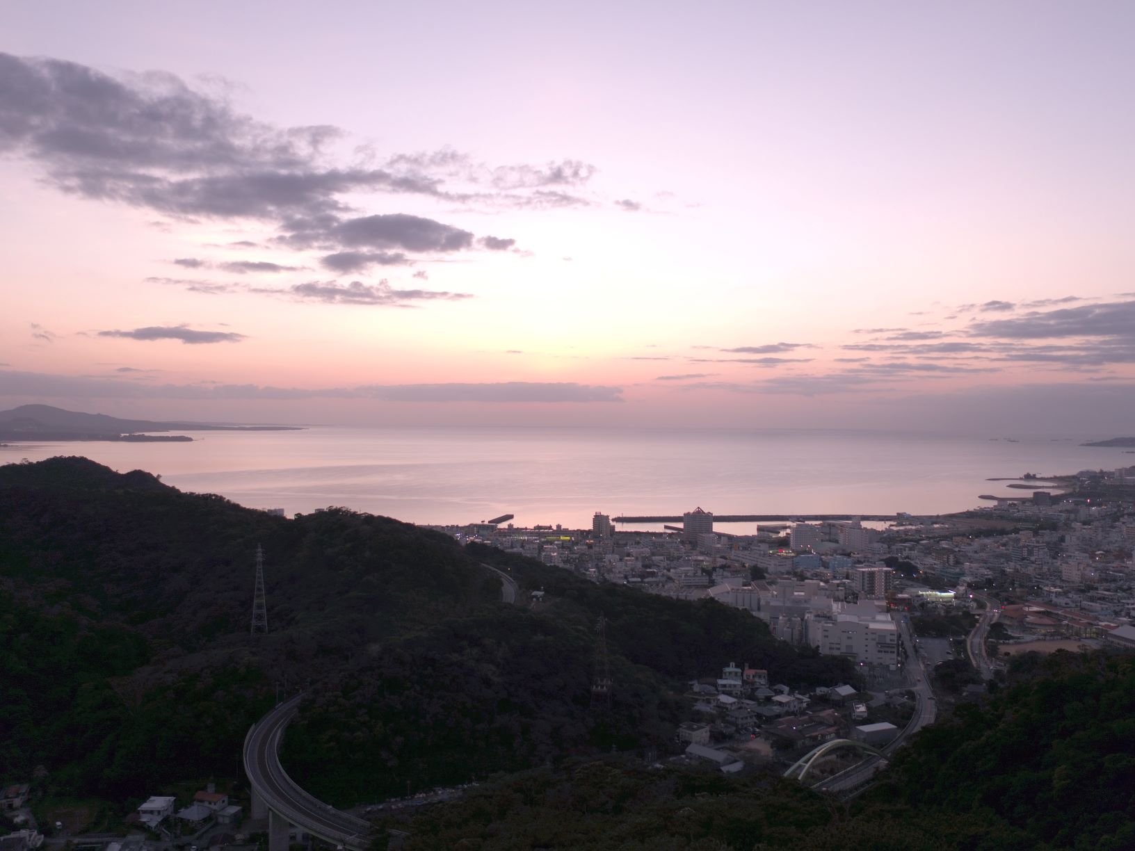 運天原漁港上空から古宇利島をはじめ、ワルミ大橋も見ることができます。